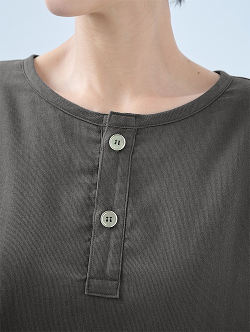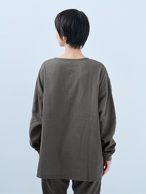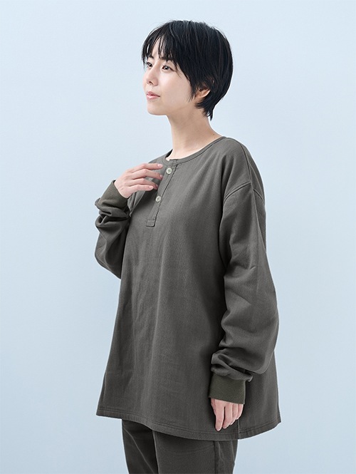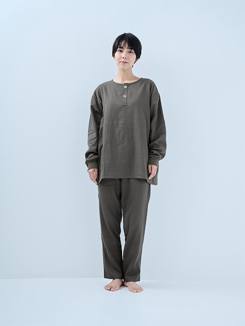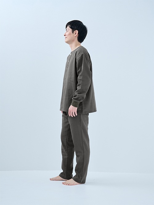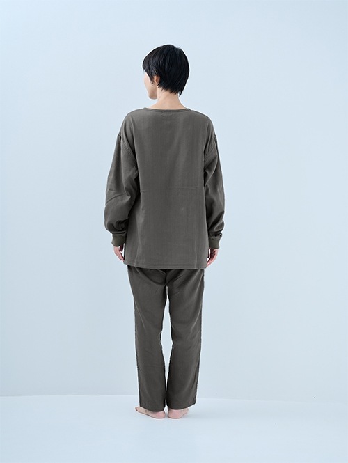 人気のおふとんパンツと同じ素材を使った長袖プルオーバーシャツです。衿ぐりにはボタンが付いており、着脱がしやすい仕様。袖口にはリブを施しているので、冷気を通しにくくあたたかさをキープします。 同素材のパンツと合わせてセットアップとして着られるほか、色を揃えたり、あえて違う色を組み合わせたりと、コーディネートの楽しみも広がります。生地づくりから縫製まで、すべて日本国内で丁寧に仕立てています。