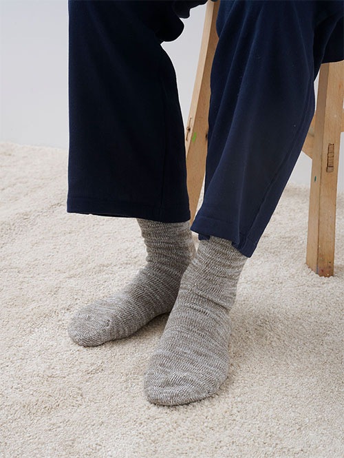 内側のシルクに紡績糸を使っており、少しボコボコとした肌触りが癖になる、肌にやさしいシルク靴下。程よい厚みでコットン靴下のようにすっきりと履いていただけます。