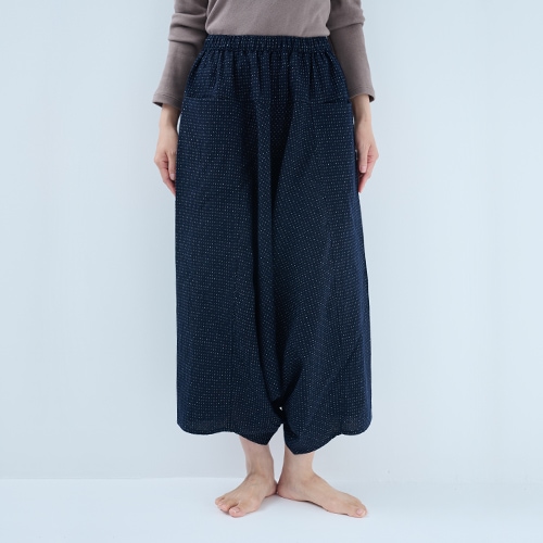 柔らかな生地感で、通年着用可能。グレー地に黄色や白の刺し子風チェック柄は、トラッドで落ち着いた印象です。股上が深く生地感のたっぷりした美しいシルエットのパンツです。開放感があって足を自由に動かせるので、リラックスシーンだけでなく、ストレッチやヨガにもおすすめですよ。