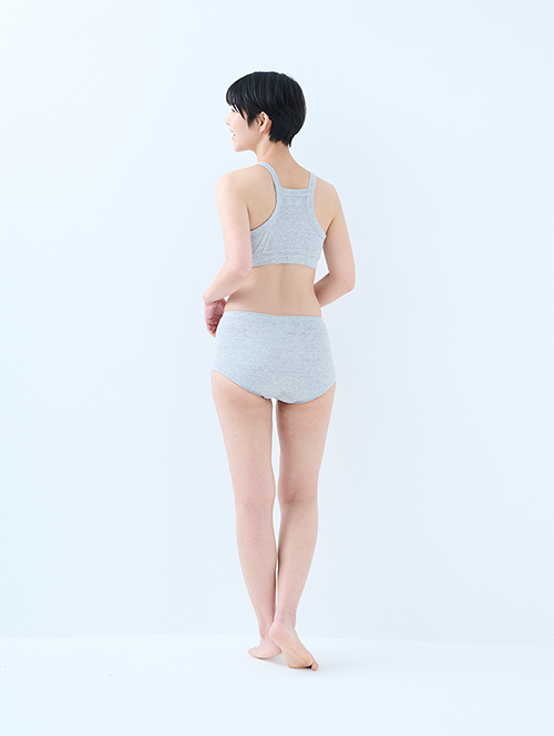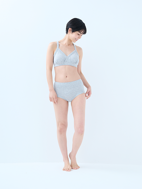 一番締め付けが気になる胸下は太めのゴムを採用することで、肌当たりが優しいのにズレにくく、安心して着用していただけます。胸のパットは取り外し可能。パットを外しても立体感が保たれる設計です。胸中心についているステッチを解くことで、授乳用ブラとしてもお使いいただけます。