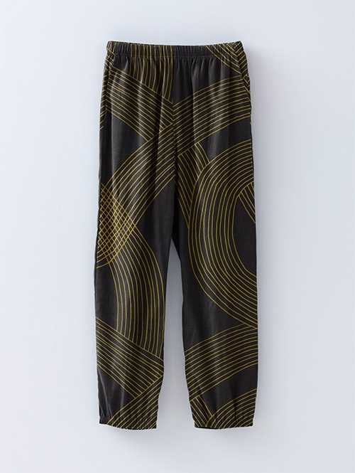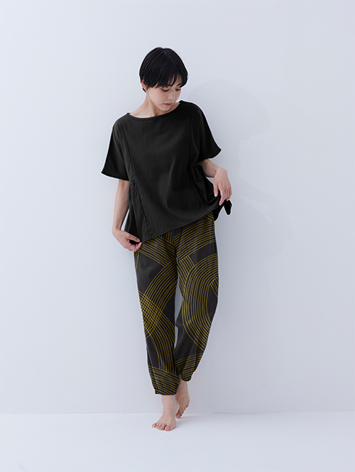 風を通すギャザーブラウスと、綿ちぢみ素材のカンフーパンツを合わせました。