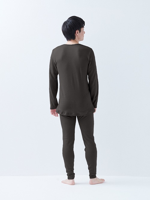暖かインナー用に紡績された、ふっくらとしたオリジナルの綿糸を使用。和歌山の熟練のニッターに頼みこんで用意して頂いた旧式の編み設備でふんわりソフトな風合いで編まれています。たっぷりと空気を包み込むため、保温性に優れ、とても軽くて柔らかな(感動の)着心地。軽めの裏起毛をかけてますので肌当たりもソフトです。