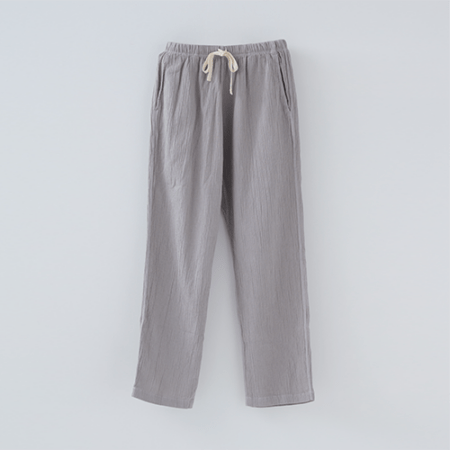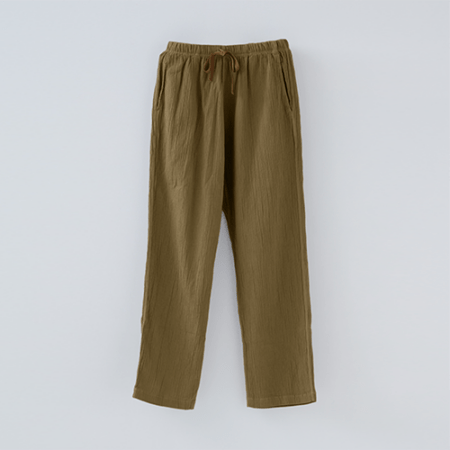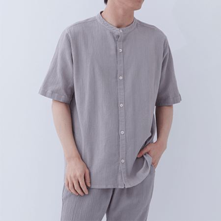 「波シボ」といわれる生地の形状は、ステテコドットコムの「通常のちぢみ」よりも凹凸感がはっきりしています。初めから表面に程よいシワ感を出すことでこなれた印象に。座りジワなども軽減され、リラックスできるのにだらしなく見えないのが「和紙混ボタニカル」のいいところ。旅行先でふらっと立ち寄った銭湯や、おしゃれなカフェでひと休憩。様々なシーンに対応する抜けすぎないかっこよさを兼ね備えた一枚です。
