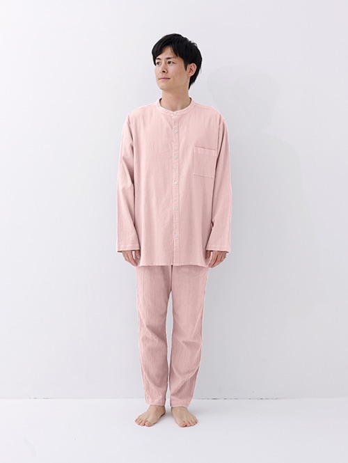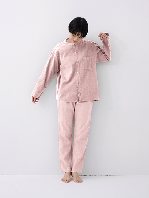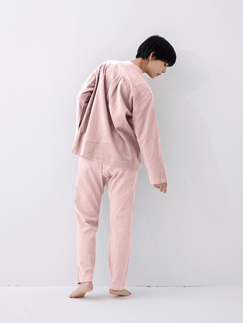 「波シボ」といわれる生地の形状は、ステテコドットコムの「通常のちぢみ」よりも凹凸感がはっきりしています。初めから表面に程よいシワ感を出すことでこなれた印象に。座りジワなども軽減され、リラックスできるのにだらしなく見えないのが「和紙混ボタニカル」のいいところ。旅行先でふらっと立ち寄った銭湯や、おしゃれなカフェでひと休憩。様々なシーンに対応する抜けすぎないかっこよさを兼ね備えた一枚です。