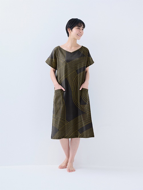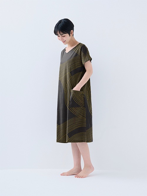 Vネックワンピースは、シーンを選ばず着用できるよう丈を長めにリニューアルしました。ゆったりシルエットで風通しが良く、旅行やお家でのくつろぎタイムだけでなく、銭湯やジムの後の着替えなど、ちょっとしたお出かけにも便利です。
