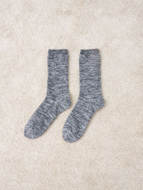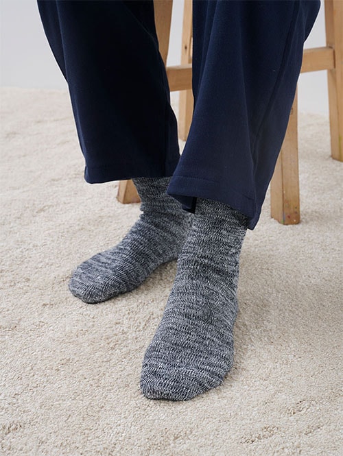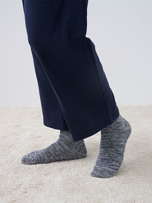 あまよりガーゼのおふとんパジャマと、肌側シルクのやさしい靴下を組み合わせました。