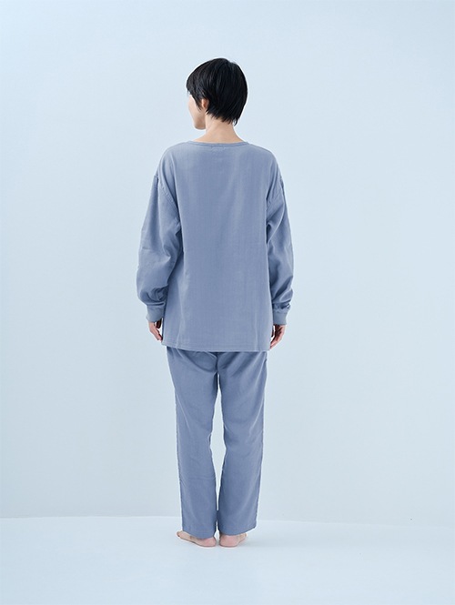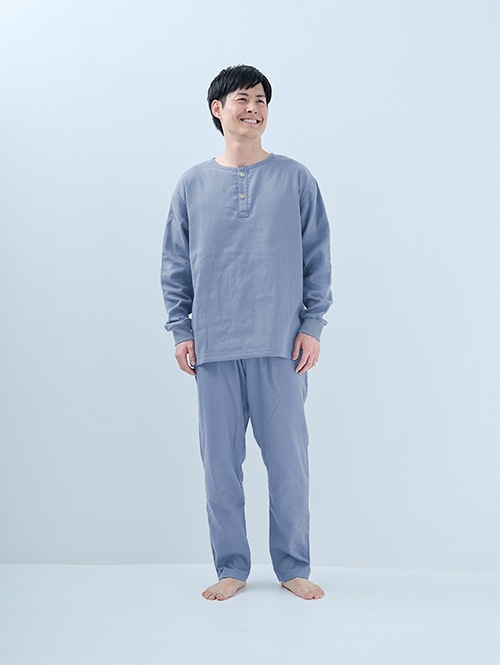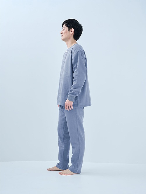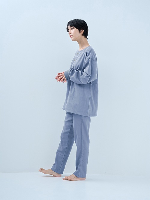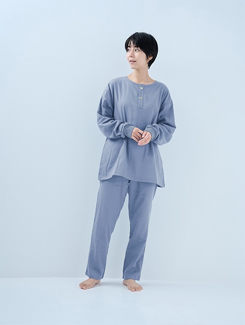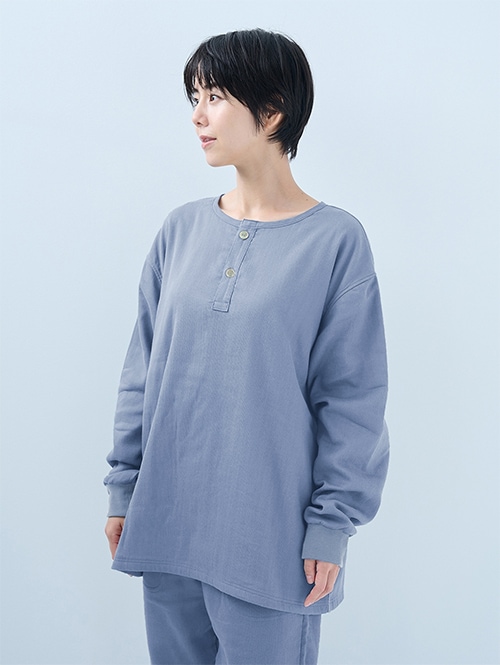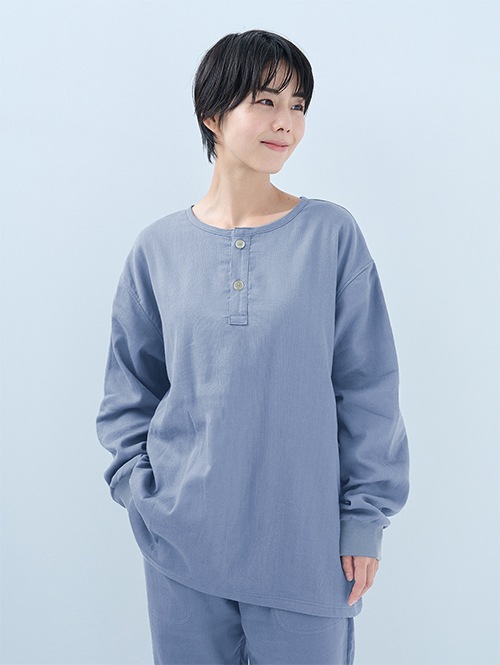 人気のおふとんパンツと同じ素材を使った長袖プルオーバーシャツです。衿ぐりにはボタンが付いており、着脱がしやすい仕様。袖口にはリブを施しているので、冷気を通しにくくあたたかさをキープします。 同素材のパンツと合わせてセットアップとして着られるほか、色を揃えたり、あえて違う色を組み合わせたりと、コーディネートの楽しみも広がります。生地づくりから縫製まで、すべて日本国内で丁寧に仕立てています。