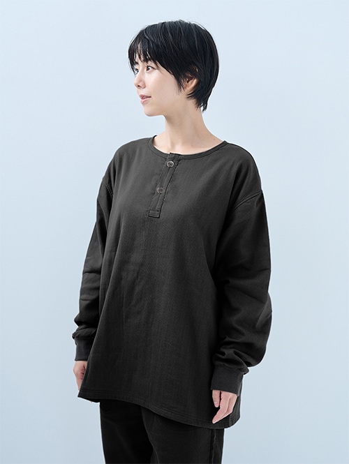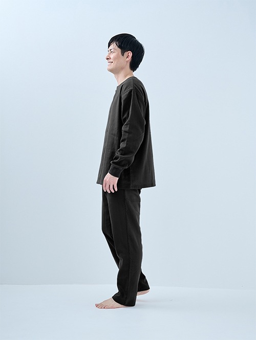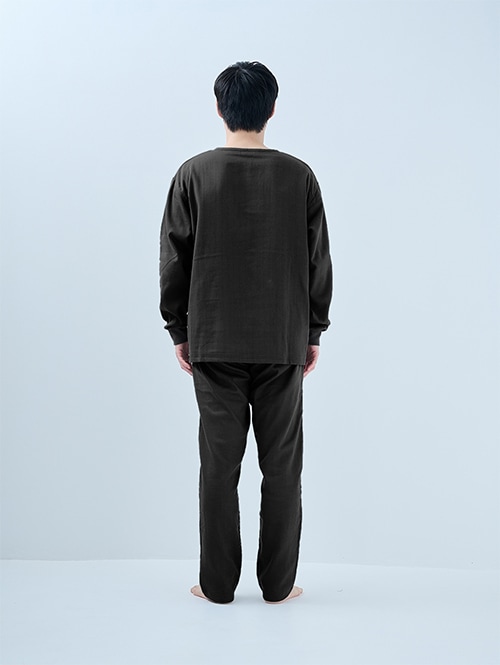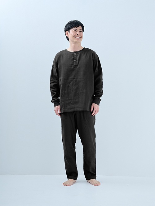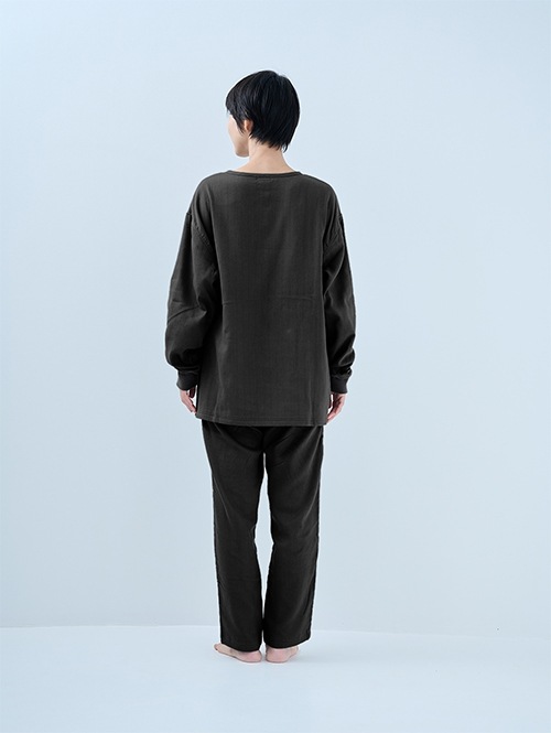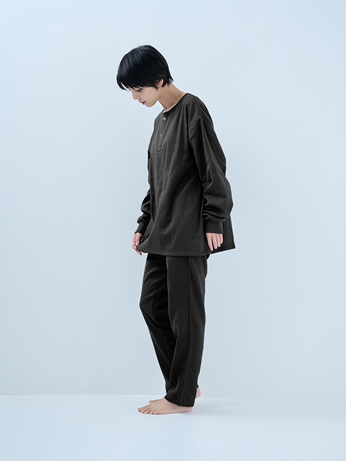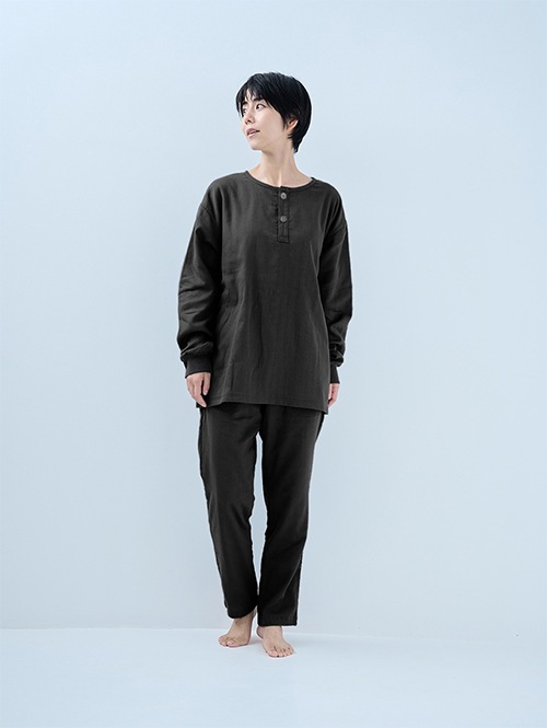 人気のおふとんパンツと同じ素材を使った長袖プルオーバーシャツです。衿ぐりにはボタンが付いており、着脱がしやすい仕様。袖口にはリブを施しているので、冷気を通しにくくあたたかさをキープします。 同素材のパンツと合わせてセットアップとして着られるほか、色を揃えたり、あえて違う色を組み合わせたりと、コーディネートの楽しみも広がります。生地づくりから縫製まで、すべて日本国内で丁寧に仕立てています。