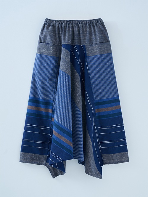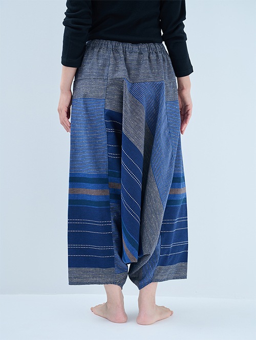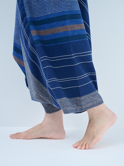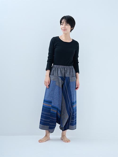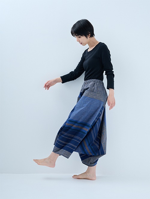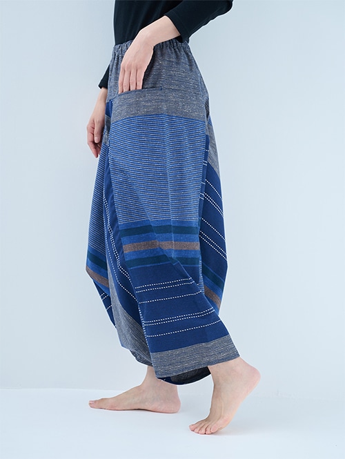 和木綿 モモンガパンツの中では、比較的張りがあり、ふっくらとしたボリューム感がある生地です。大胆な大柄デザインで存在感のある一枚です。股上が深く生地感のたっぷりした美しいシルエットのパンツです。開放感があって足を自由に動かせるので、リラックスシーンだけでなく、ストレッチやヨガにもおすすめですよ。