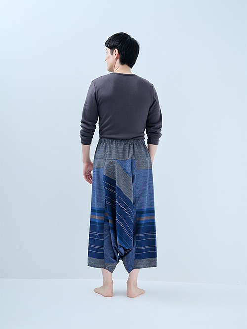 大正二年創業の九州、福岡の宮田織物さんとのコラボレーションアイテム。ステテコドットコムのモモンガパンツをベースに、久留米絣(くるめかすり)の流れをモダンに落とし込んだ美しい柄と、天然素材の着心地にこだわった宮田織物さんオリジナルの久留米織・和木綿生地を使用しています。
