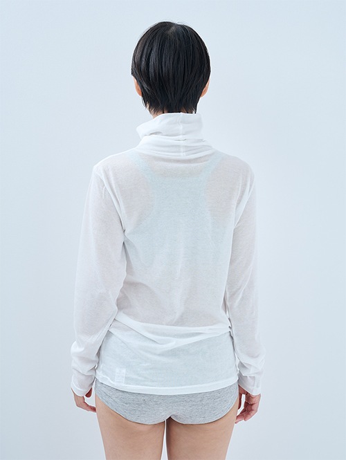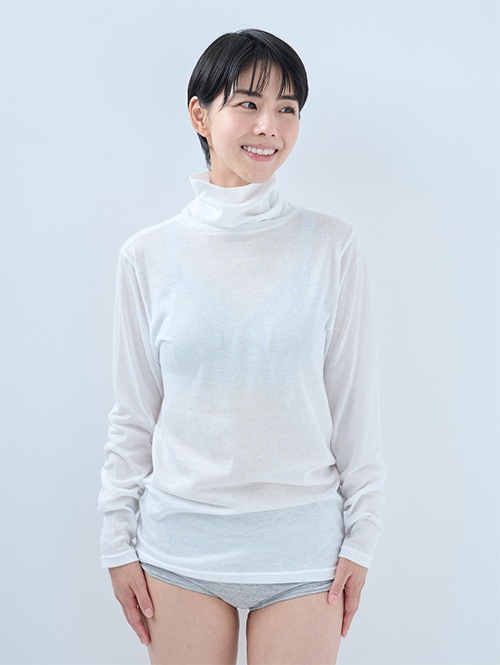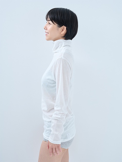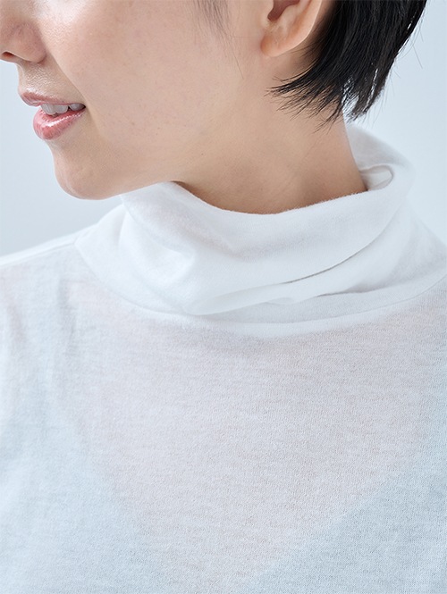薄手でアウターに響きにくいタートルネック。コットン100%なので蒸れることがなく、ふんわり暖かさを感じられます。衿部分は2重の仕立てにしているのでニットや、インナーの襟から見えても大丈夫。