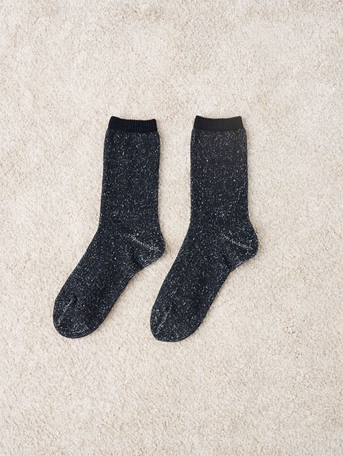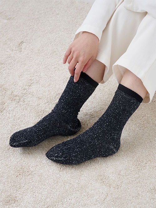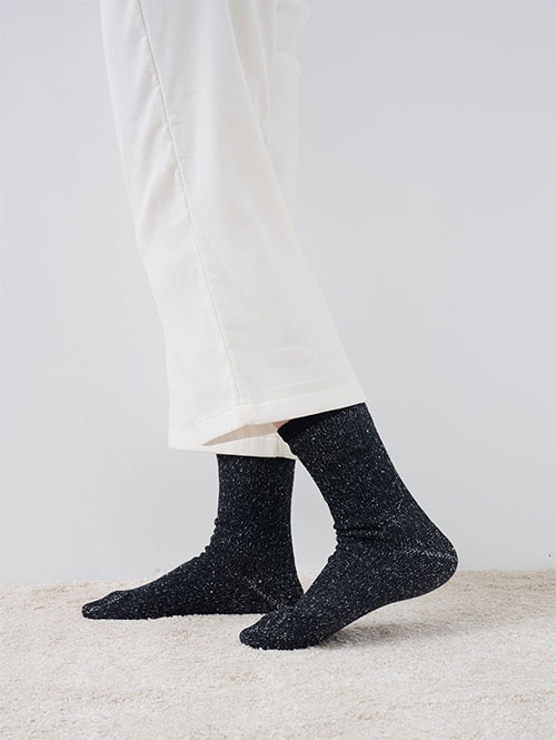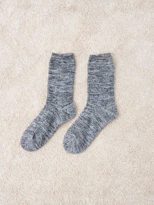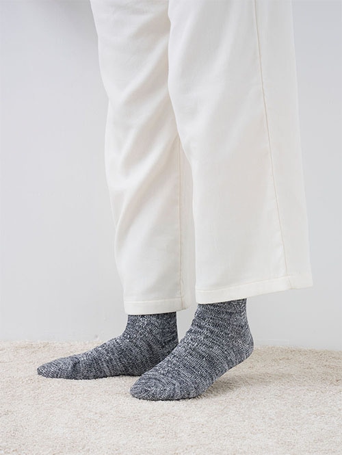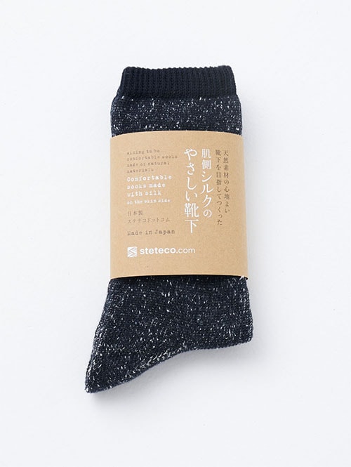 内側のシルクに紡績糸を使っており、少しボコボコとした肌触りが癖になる、肌にやさしいシルク靴下。程よい厚みでコットン靴下のようにすっきりと履いていただけます。