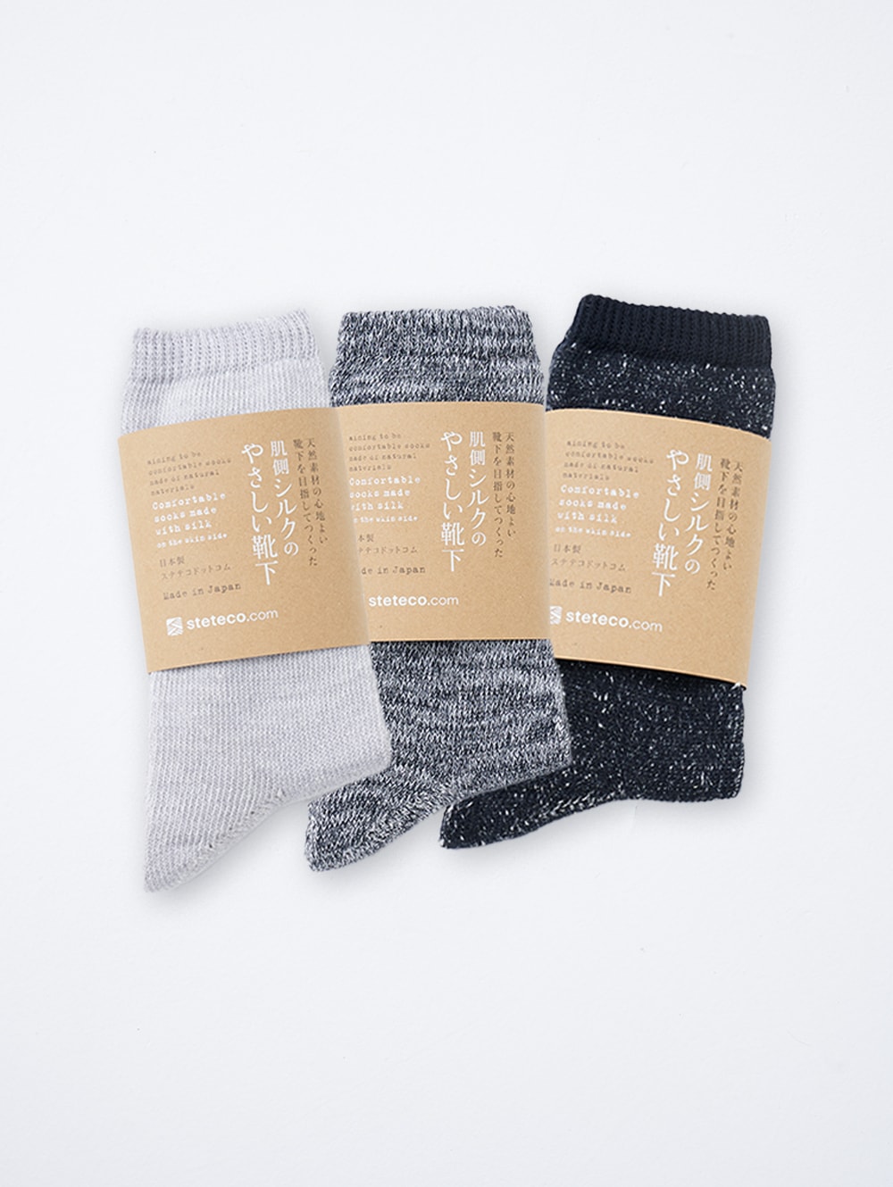 天然素材の心地よい靴下を目指してつくった、肌側シルクのやさしい靴下を組み合わせました。
