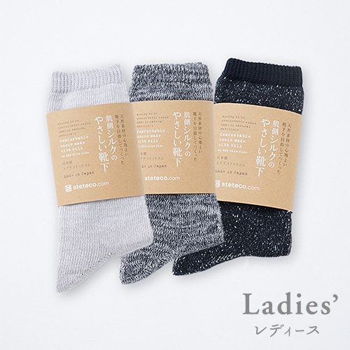 天然素材の心地よい靴下を目指してつくった、肌側シルクのやさしい靴下を組み合わせました。