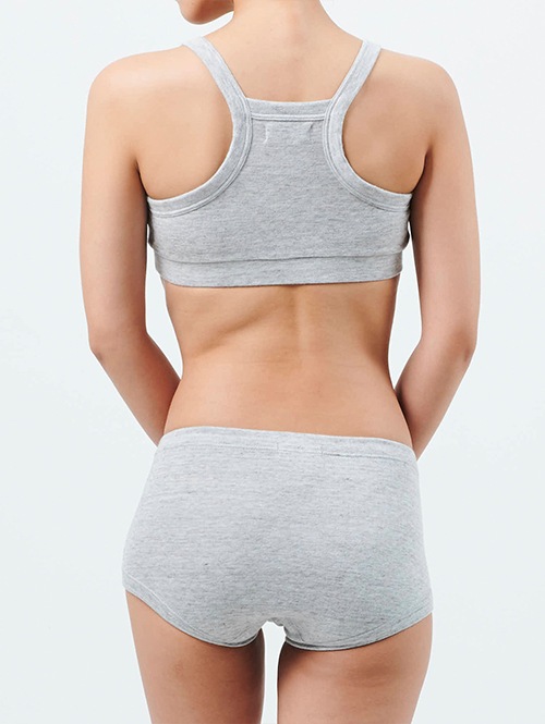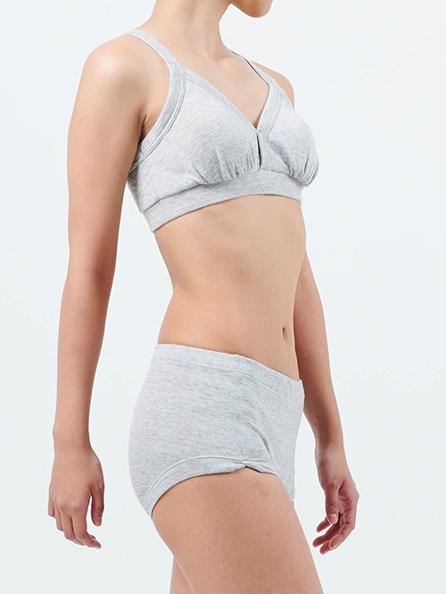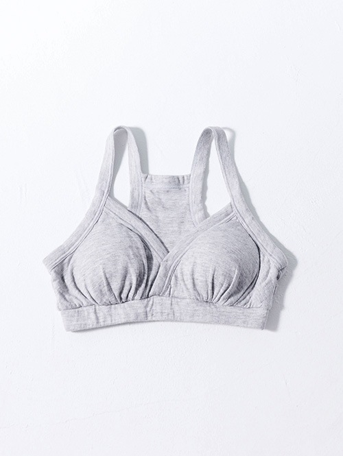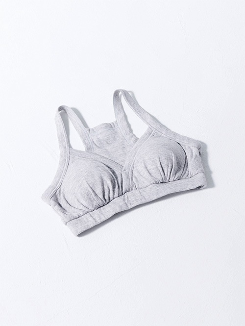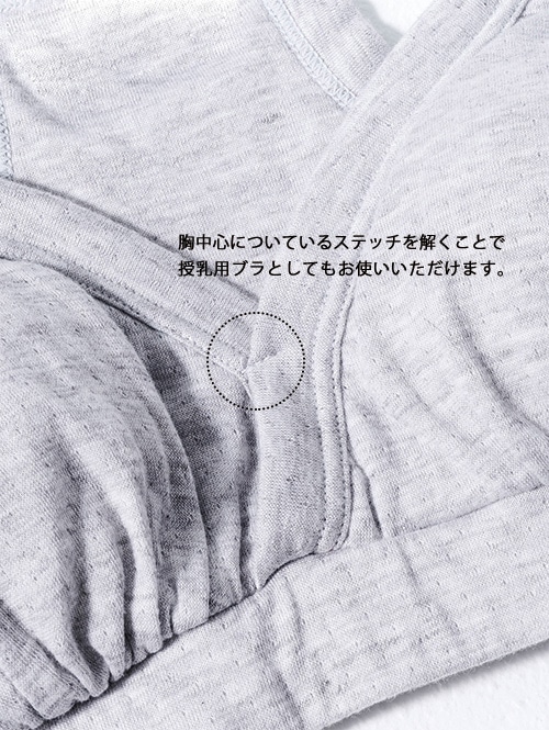 一番締め付けが気になる胸下は太めのゴムを採用することで、肌当たりが優しいのにズレにくく、安心して着用していただけます。胸のパットは取り外し可能。パットを外しても立体感が保たれる設計です。胸中心についているステッチを解くことで、授乳用ブラとしてもお使いいただけます。