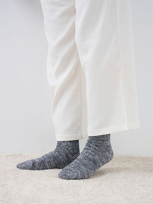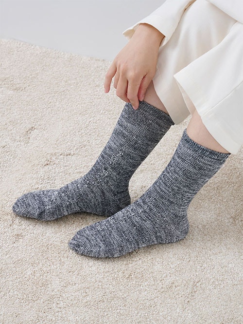 あまよりガーゼのおふとんパジャマと、肌側シルクのやさしい靴下を組み合わせました。