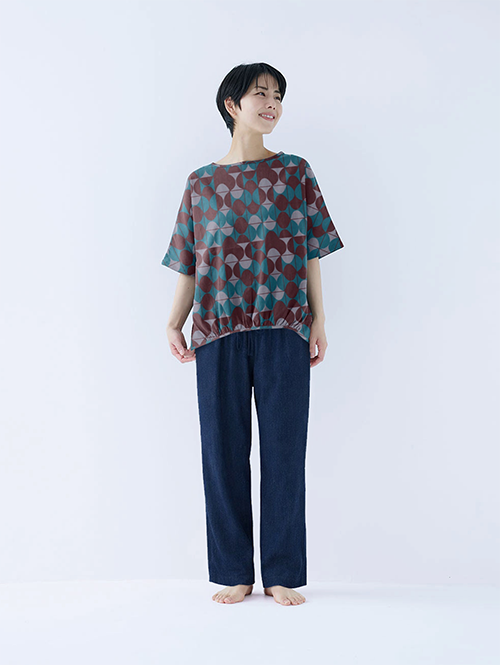 リニューアルしたバルーンブラウスと、ちぢみデニムのステテコパンツを合わせました。