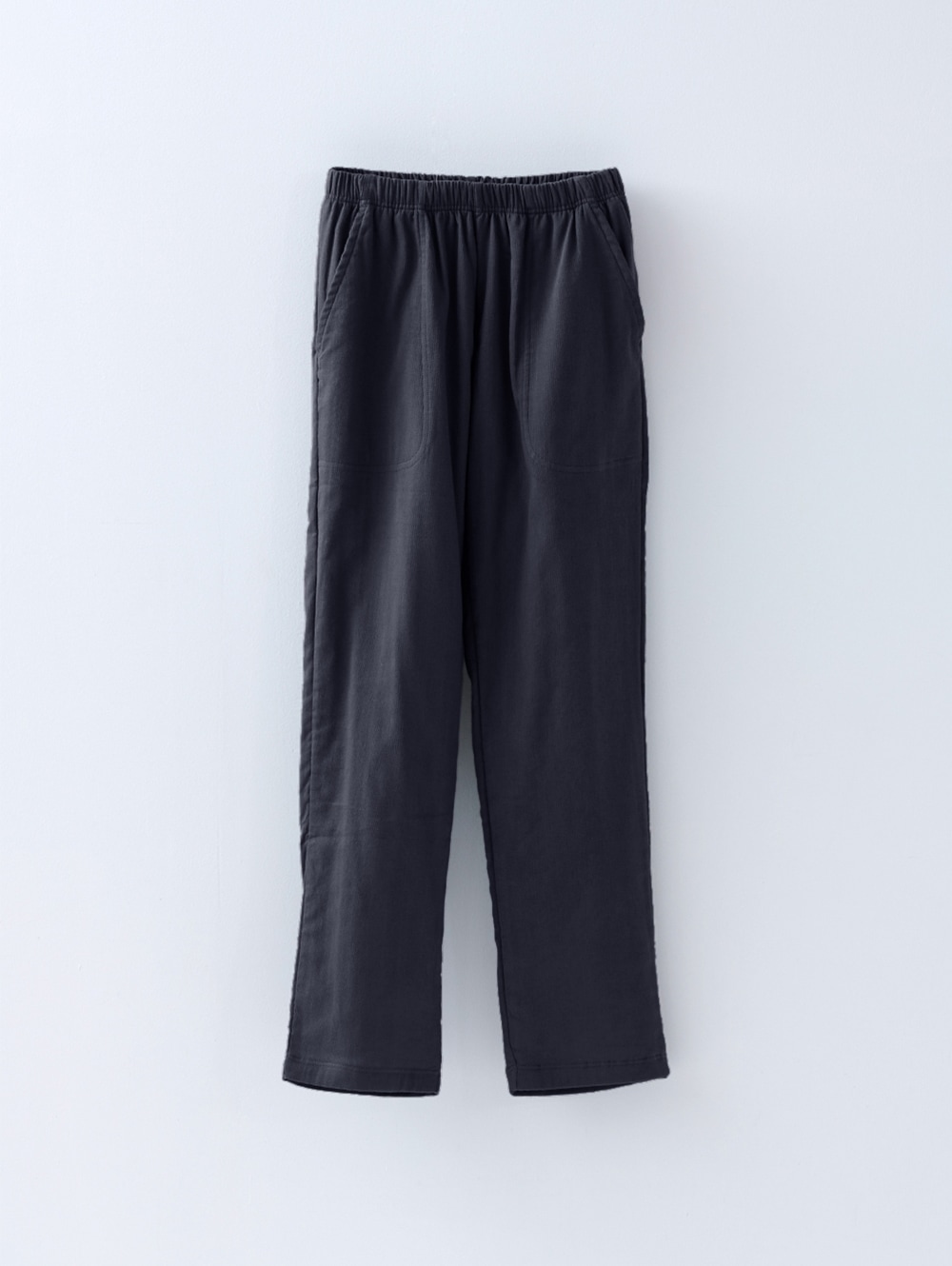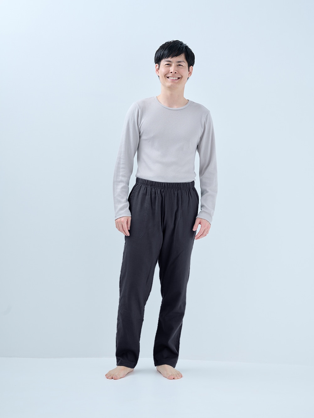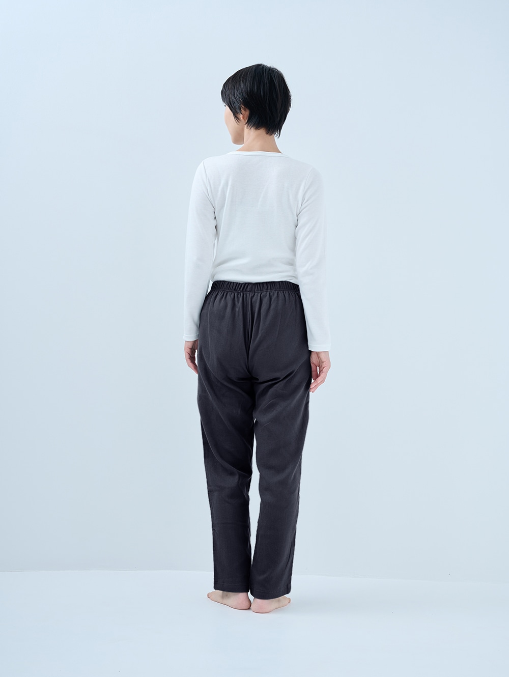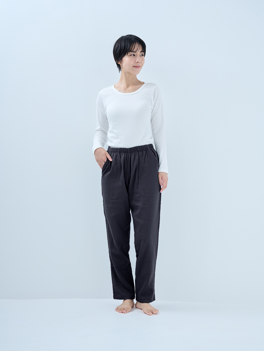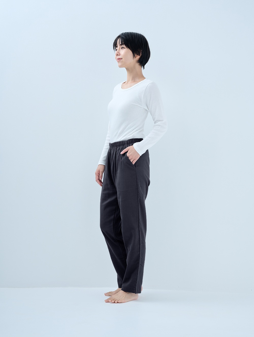 家ナカだけでなく、ぶらっと外にも穿いていける楽ちんパンツ。柔らかく、優しい穿き心地の新しいリラックスパンツです。生地づくりから縫製まで全て日本国内で行っています。